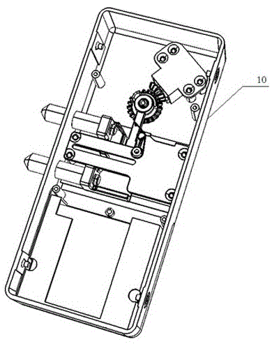 在圖中:10.金屬底座;11.定位柱;12.電機(jī)座;13.導(dǎo)軌;14.通孔;20.電機(jī);21.電機(jī)壓板;30.電機(jī)齒輪;40.旋鈕齒輪;41.擋片;50.門(mén)內(nèi)旋鈕;51.主軸;60.撥桿;70.滑板;71.插銷(xiāo);72.u型槽;80.滑板壓板;81.第二通孔;90.助力彈簧。