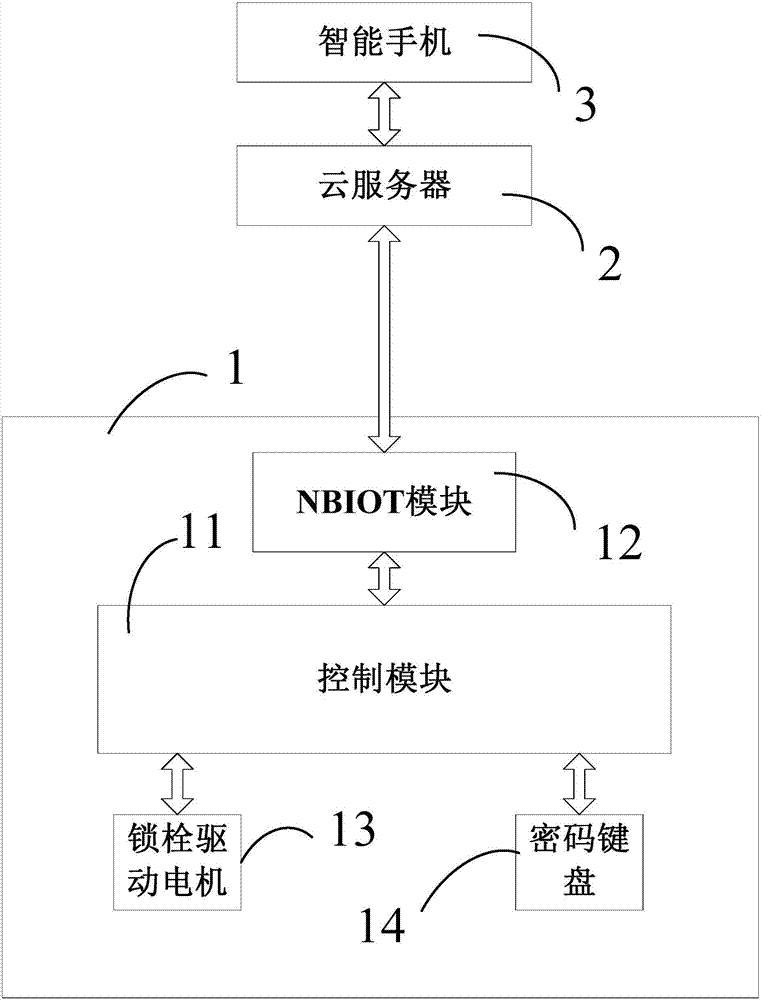 控制模塊11控制所述鎖體解鎖或鎖付,通信模塊12采用窄帶物聯(lián)網(wǎng)通信模塊(即NBIOT模塊),控制模塊11通過NBIOT模塊與一個云服務(wù)器2直接通信。因此,智能手機(jī)3就可以很快捷的通過云服務(wù)器2實(shí)現(xiàn)對互聯(lián)網(wǎng)智能門鎖1的運(yùn)行與管理。